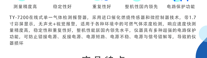 • 在線式單一氣體檢測報警器(帶顯示帶報警) TY-7200 采用進口催化燃燒傳感器和微控制器技術,帶1.7寸高清彩屏顯示,帶聲光+視覺報警,適用于各種環境中的可燃氣體濃度檢測,響應速度快,測量精度高,穩定性和重復性好,整機性能居國內領先水平。