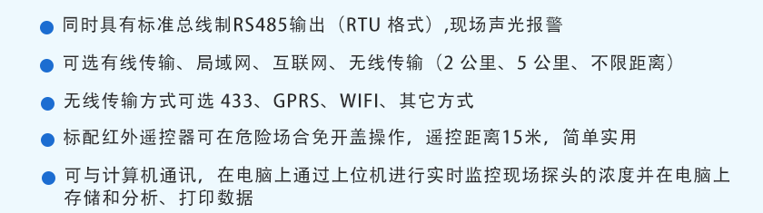 ①4-20mA信號傳輸距離1Km ②RS485信號傳輸距離2Km