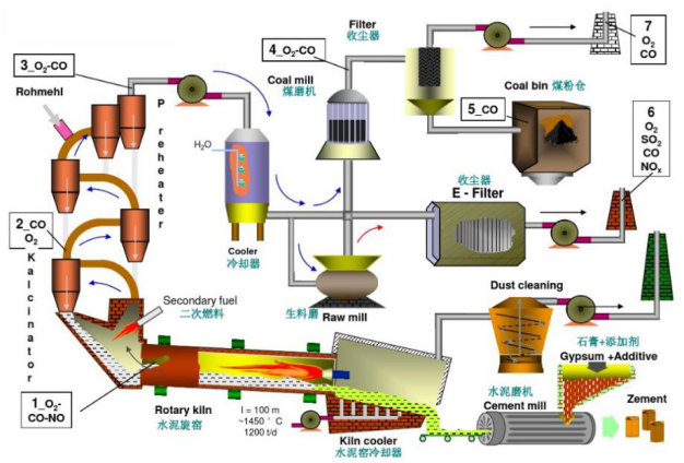 因此,通過在線氣體分析系統在線監測NO的含量,可幫助指示溫度趨勢,及時修正、避免窯溫度失控,以保證水泥熟料的質量。