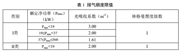 (2)煙度限值:非道路柴油移動機械排氣的不透光法煙度(光吸收系數)和林格曼黑度系數不應超過表1規定得限值。